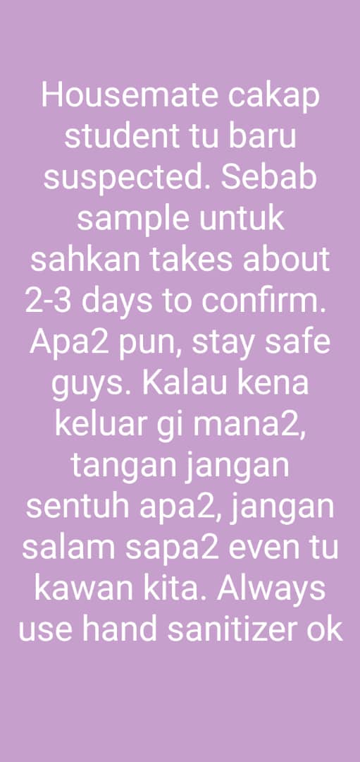 Ada khabar angin menceritakan seorang pelajar IPTA di kawasan tersebut suspek Covid-19. Namun begitu, nada warganet menjelaskan bahawa pelajar itu hanya suspek kerana ada menunjukkan gejala-gejala penyakit tersebut.