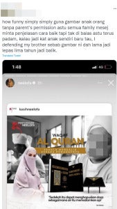 Pun begitu, ada pihak di laman Twitter memberitahu perkara itu ibarat karma apabila Neelofa sebelum ini pernah menggunakan gambar adiknya untuk mempromosi program wakaf Al-Quran miliknya melalui Pertubuhan Kasih Neelofa.